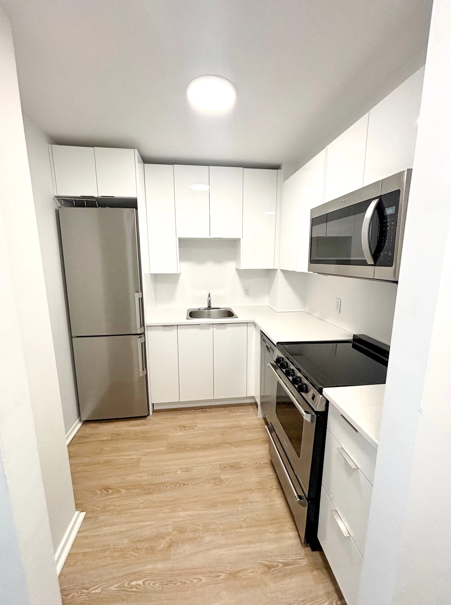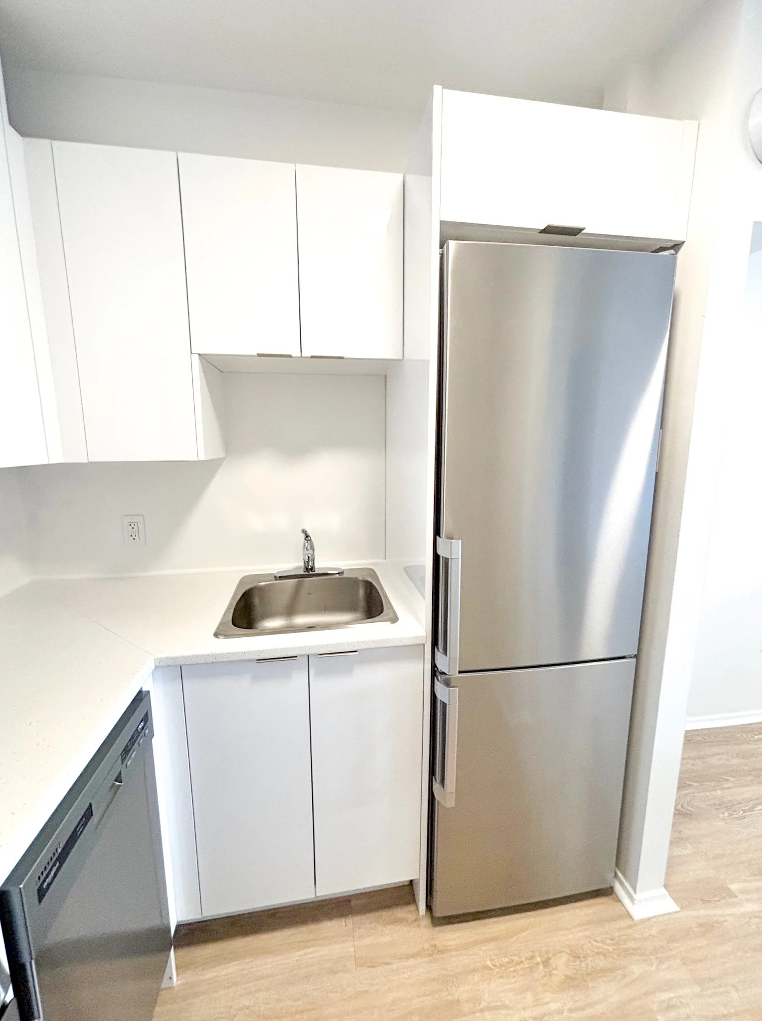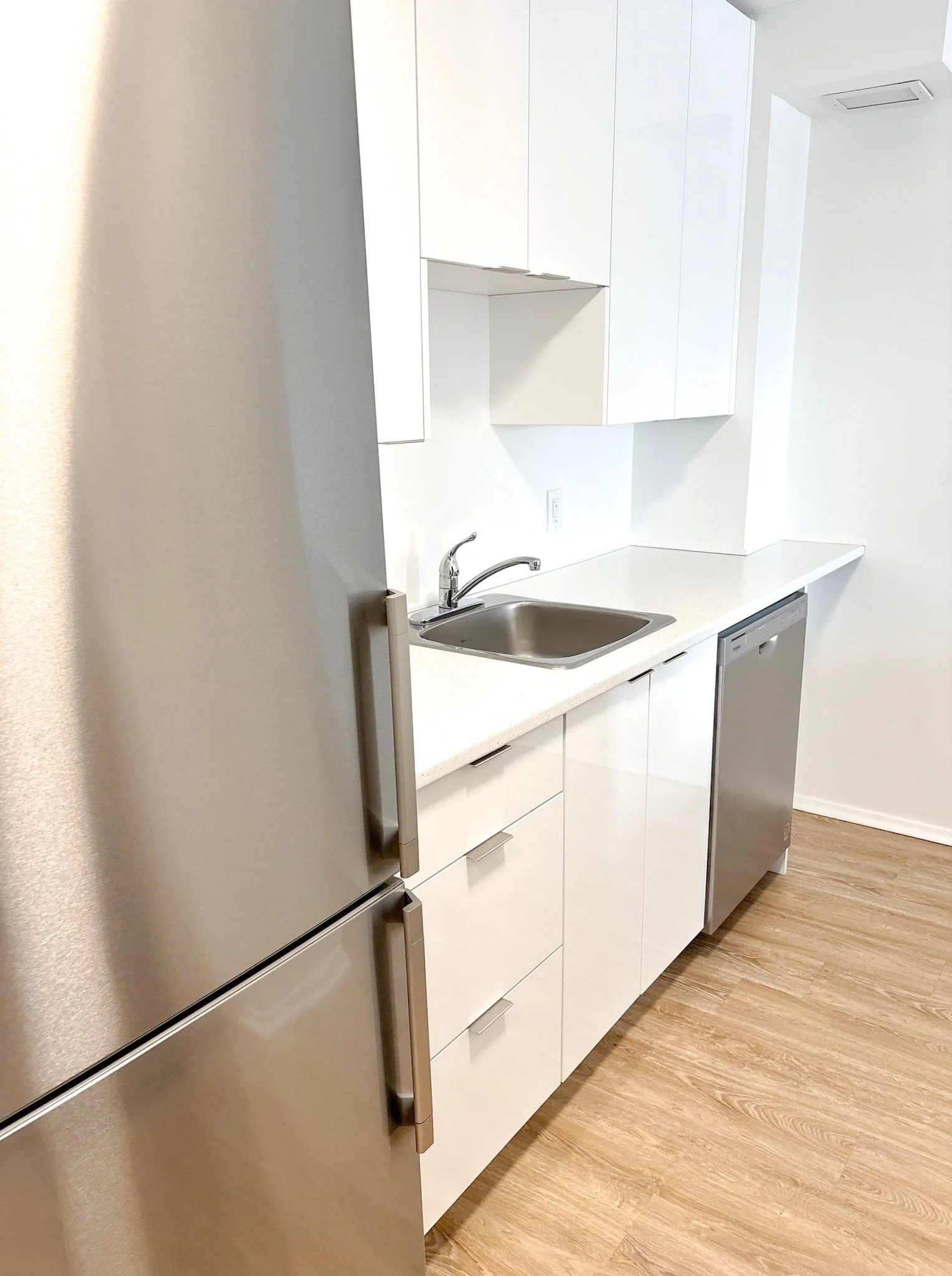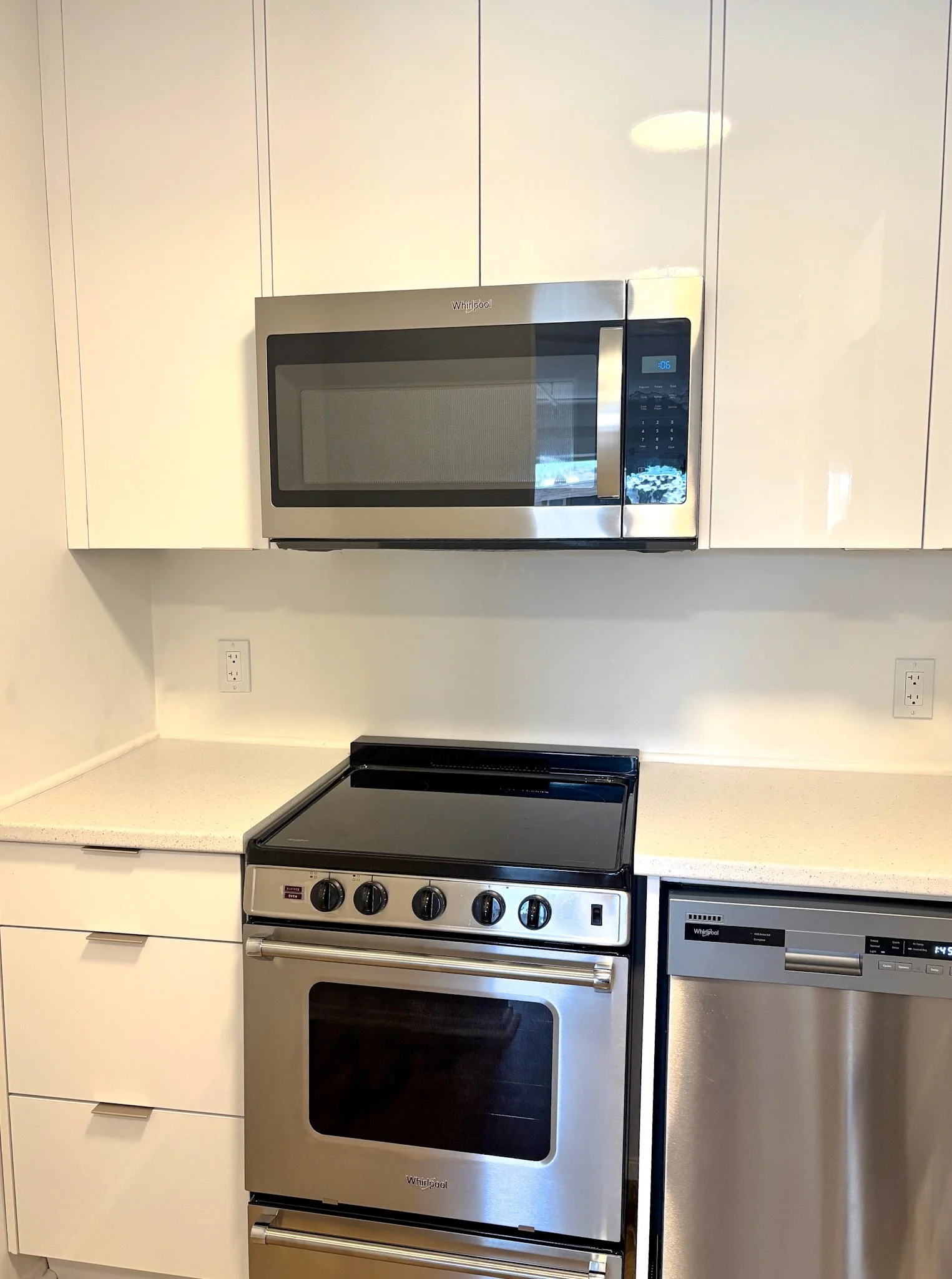 - Brand new white high-gloss cabinetry, with upgraded stainless steel appliances (fridge, stove, dishwasher, microwave)