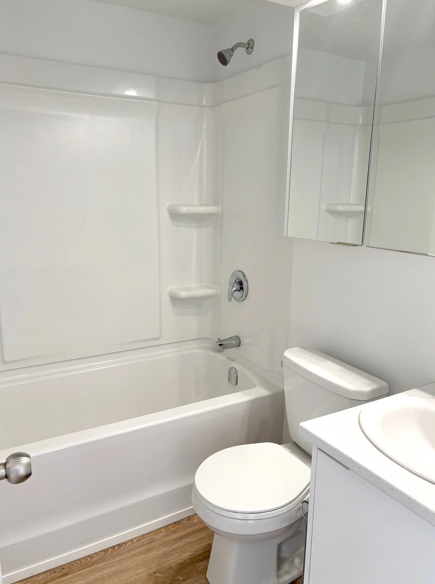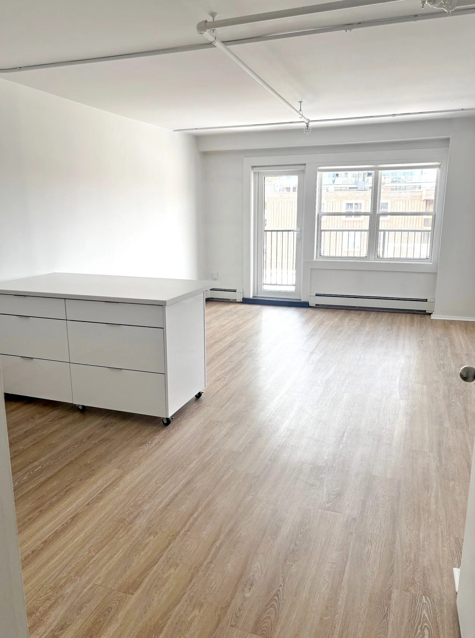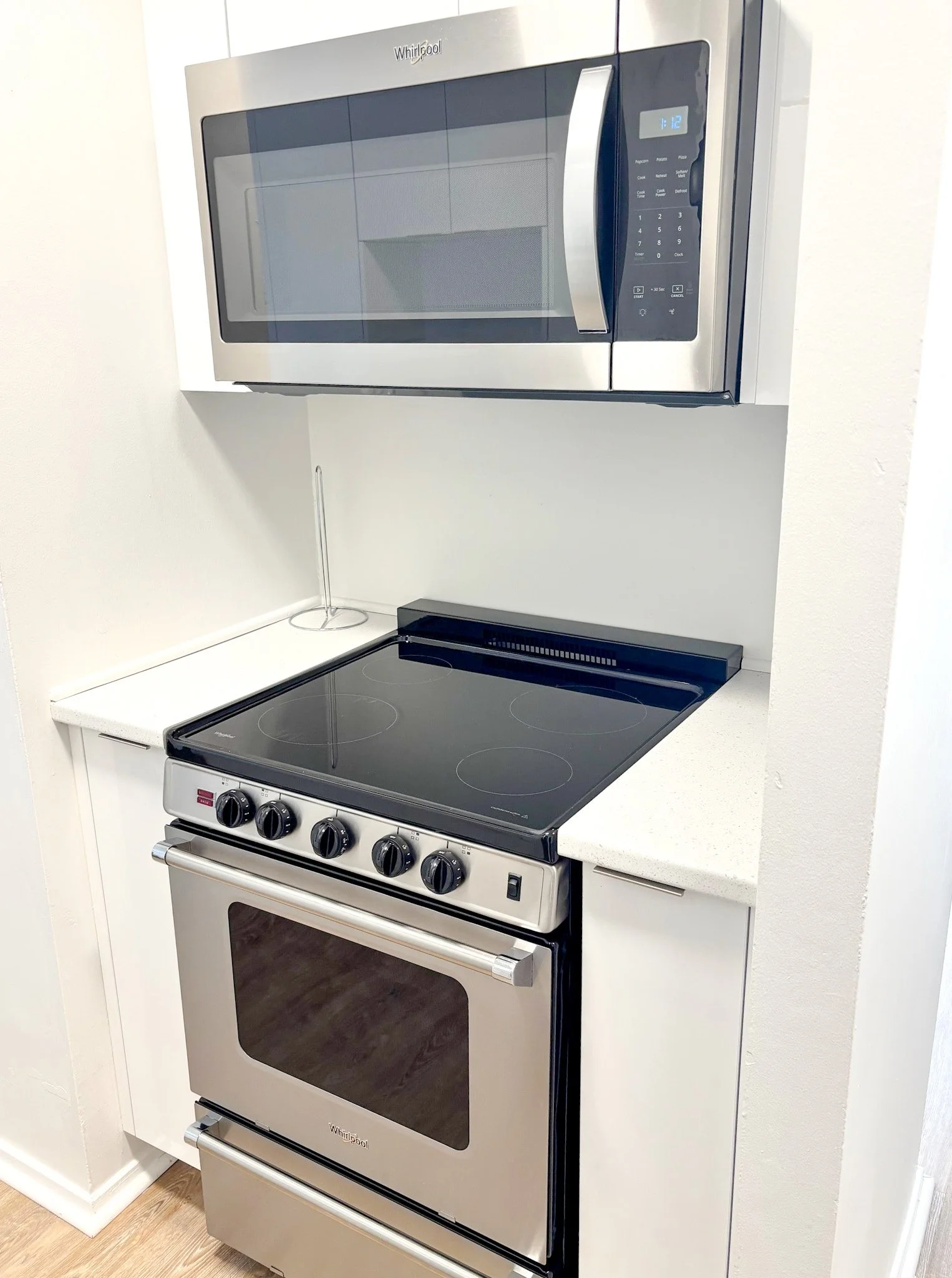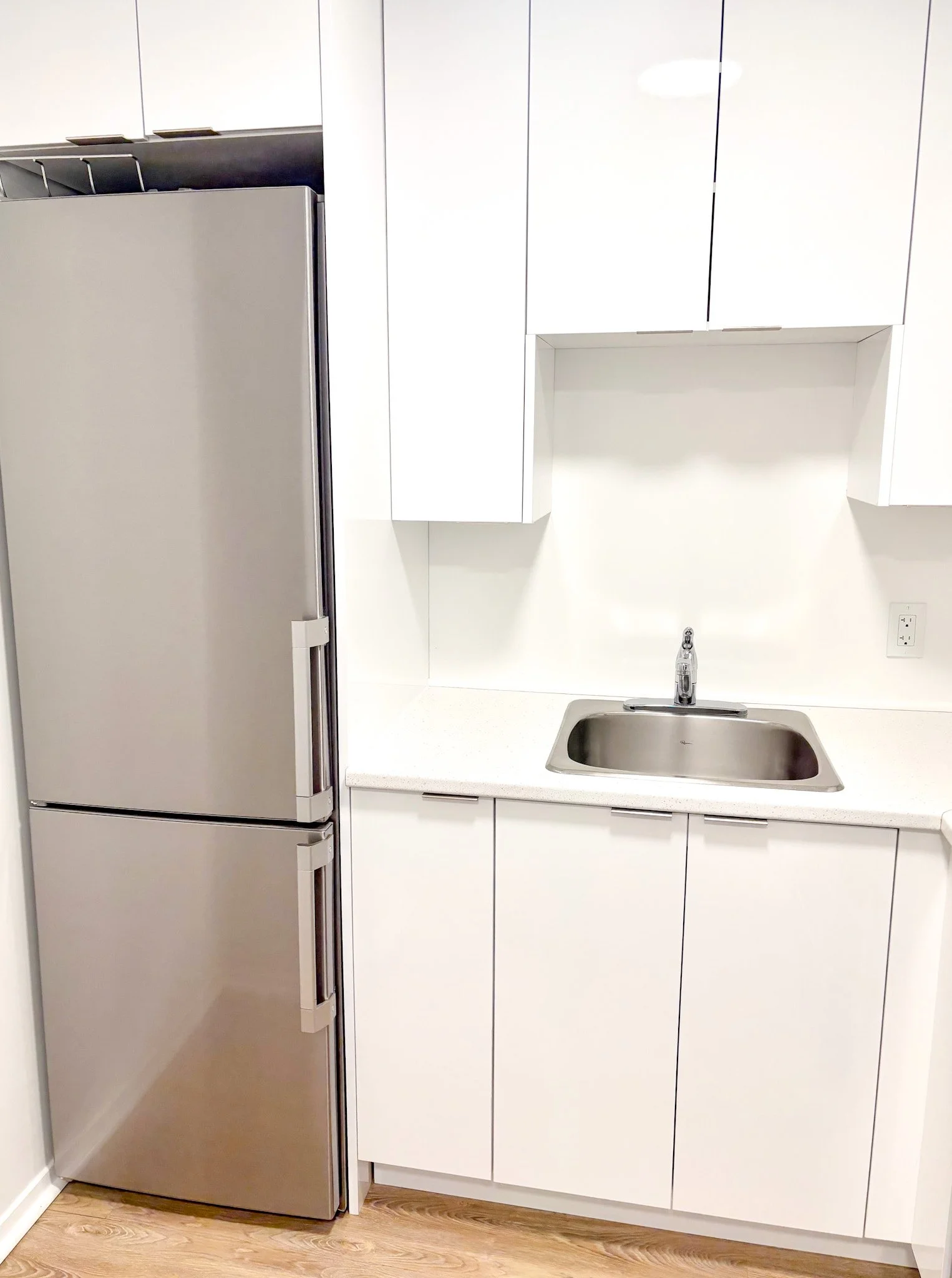 - Brand new white high-gloss cabinetry, with upgraded stainless steel appliances (fridge, stove, dishwasher, microwave)