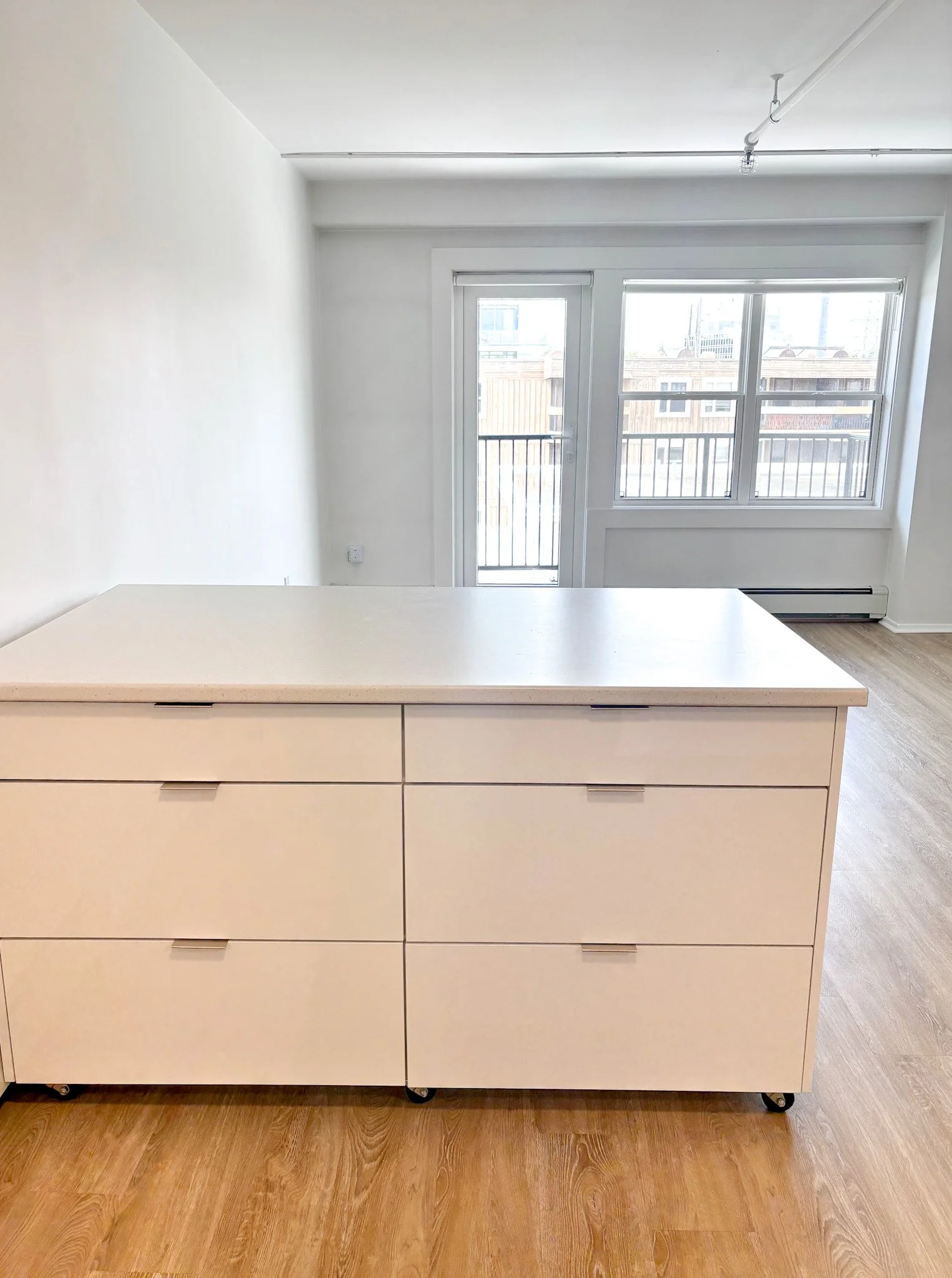 - Custom designed movable island with built-in cabinetry and bar ledge